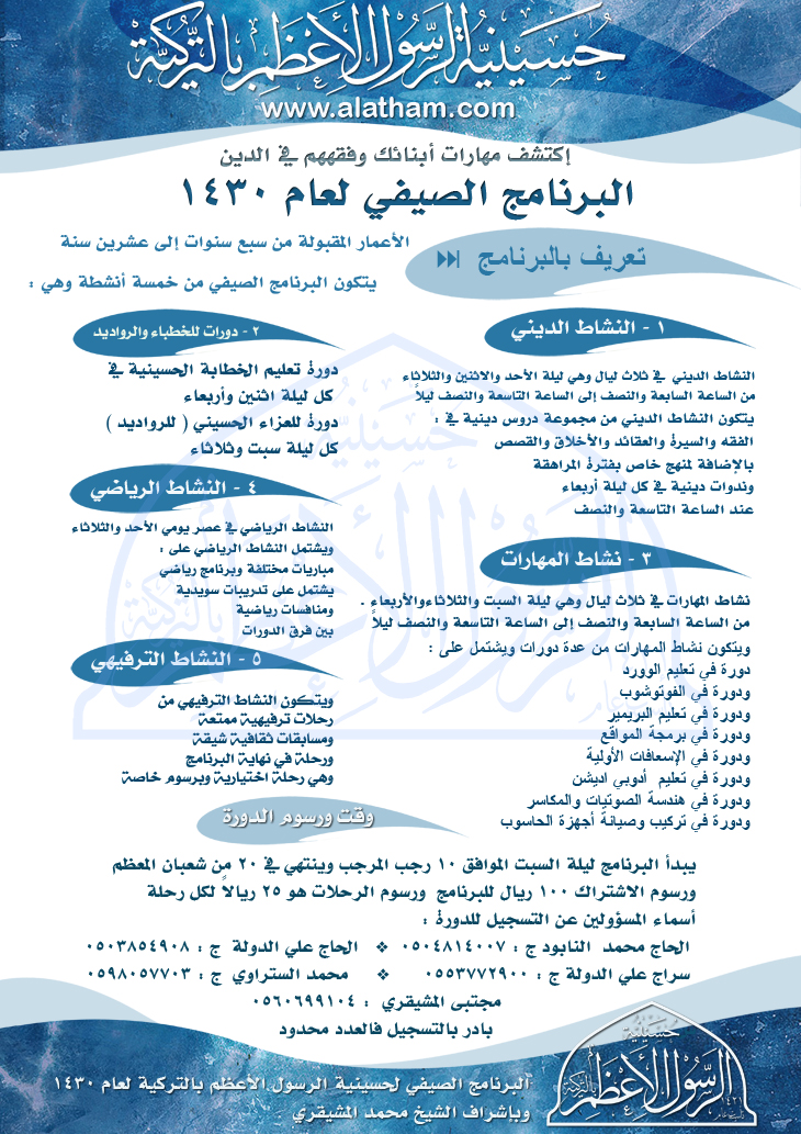 دورة تعليم الخطابة الحسينية في كل ليلة اثنين وأربعاء دورة للعزاء الحسيني ( للرواديد ) كل ليلة سبت وثلاثاء